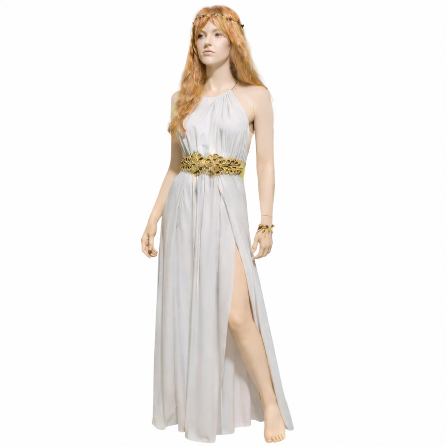 תחפושת אלה יווניה מהודרת הכוללת שמלה סקסית ארוכה עם שסעים, צמיד זהוב, חגורה ותכשיט לשיער.