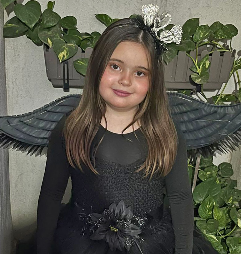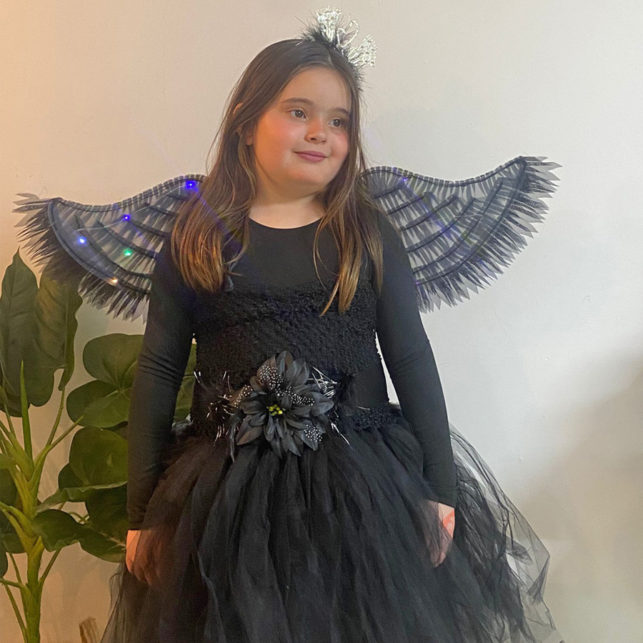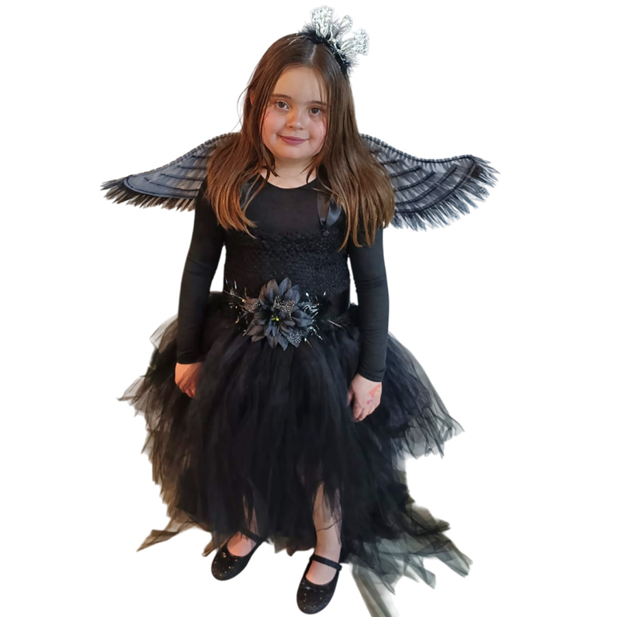 תחפושת ברבור שחור לילדות הכוללת שמלת ברבור מרהיבה עם שובל טול אחורי ליצירת מראה אלגנטי ודרמטי, קשת ברבור לשיער, חגורה עם פרח וכנפי לד שחורות.